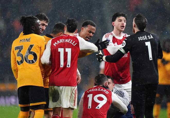 狼队社交媒体团队在视频中展示了这些画面:加布里埃尔-马丁内利在阿森纳2-1领先时,用手比出比分向主场球迷挑衅;阿森纳在领先期间故意拖延角球开出;加布里埃尔-马加良斯在一次看似头部碰撞后倒地,起身继续比赛,遭到视频嘲讽。